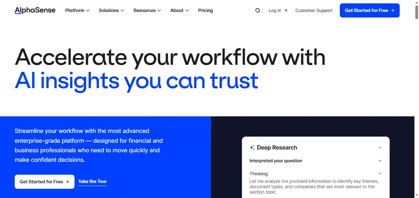 The platform also includes sentiment analysis, real-time alerts, and collaborative tools for team-based research. As of 2026, AlphaSense is trusted by over 6,000 enterprise customers, including a majority of the S&P 500 and many of the top hedge funds.