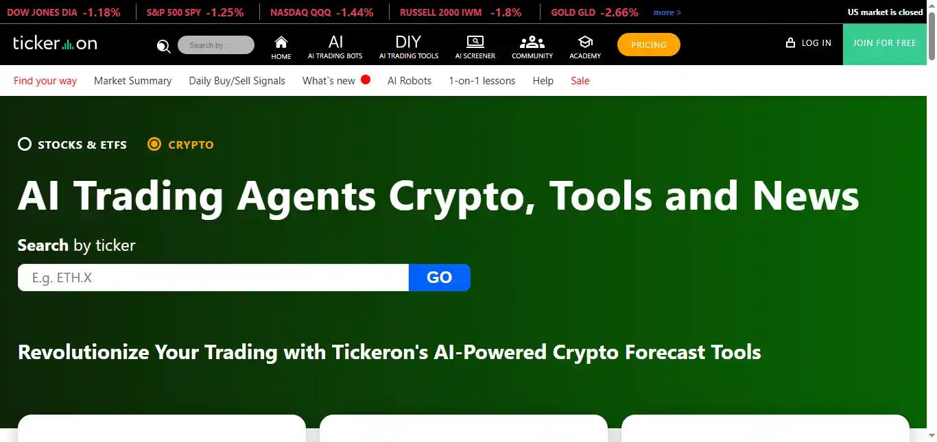 Tickeron is an AI-driven platform that delivers forecasts, pattern detection, and trading signals across stocks, ETFs, forex, and crypto.