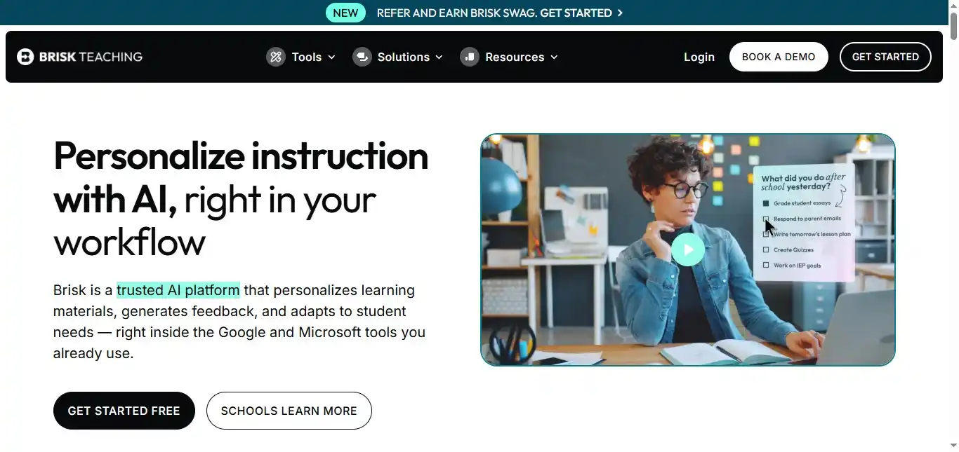 BriskTeaching isn’t just another AI tool; it focuses on smart content integration. It’s an intelligent assistant that works within your favorite platforms, like Google Docs, Slides, and Classroom. So, it works best if you already use digital tools in your teaching.