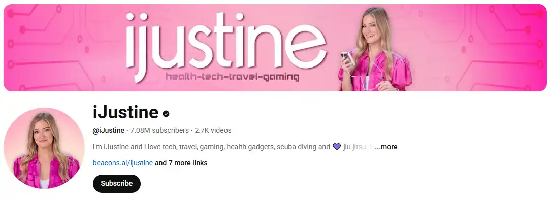 iJustine, run by Justine Ezarik, is one of the most popular tech YouTube channels focused on tech reviews, unboxing, and lifestyle content.