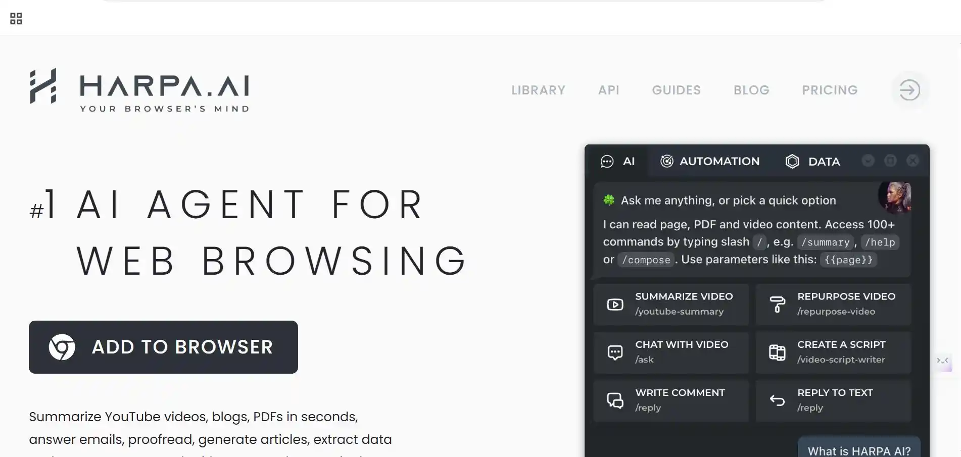 Harpa AI moves beyond a simple chat assistant to become an AI automation agent. While it matches Sider in summarization and contextual chat, its distinguishing feature is the ability to create and execute complex, multi-step web automation flows.