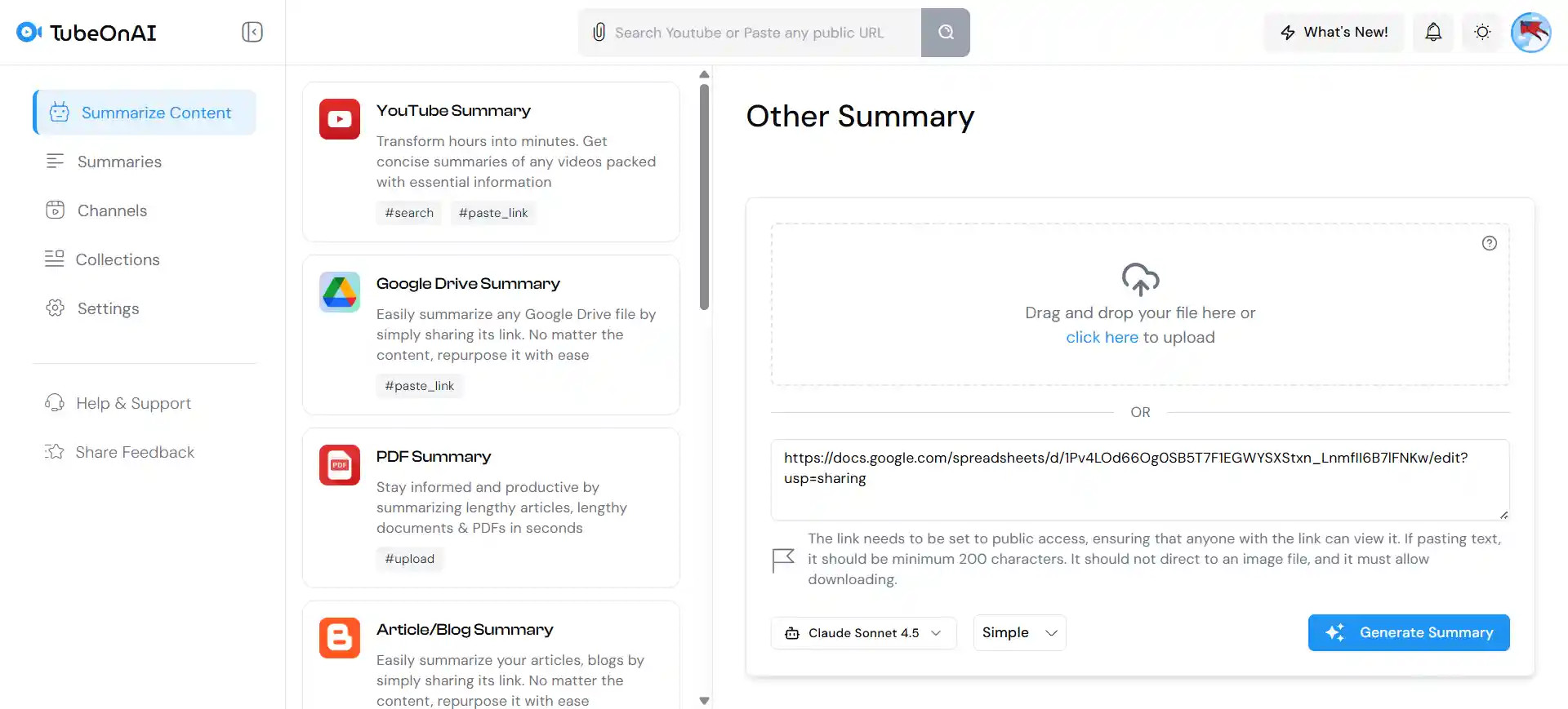 Paste the public URL or Upload the Excel file directly in TubeOnAI.