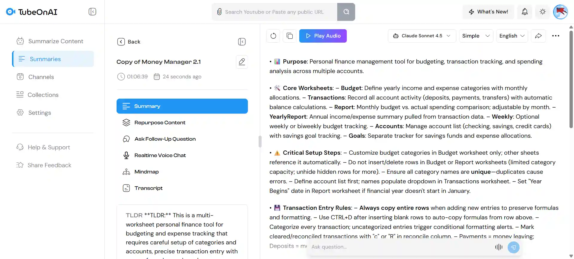 TubeOnAI summarizes your Excel sheet and explains each parts beautifully.