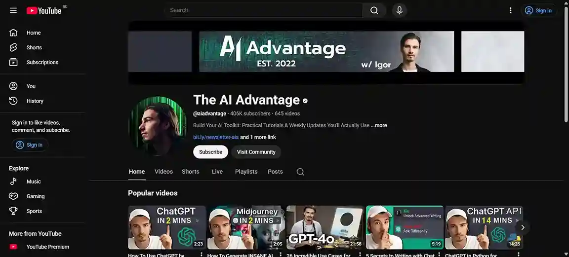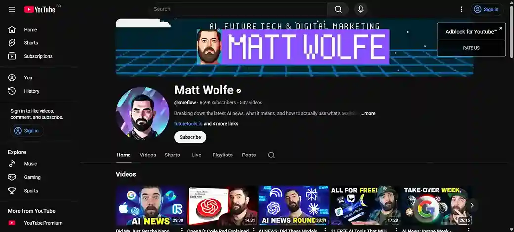 Matt Wolfe is a tech fanatic, and in his YouTube channel, he talks about advanced technology and the fast-changing AI world. If you want to learn about AI, what’s happening in the sector, what to look out for, and the future of AI, you can check out Matt Wolfe’s YouTube channel. His videos will discuss news in the AI sector, review different AI tools and products, saving you a lot of the hard work. With his video, you learn a lot about ChatGPT, AI Music, Generative Art, etc.